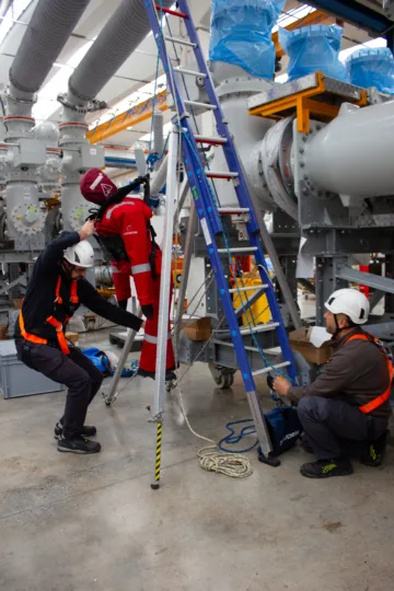 Sapere eseguire correttamente le manovre di salvataggio di un collega infortunato è fondamentale per evitare un peggioramento delle sue condizioni fisiche e per riuscire a prestare soccorso in tempi più celeri. Per questo, durante la Safety Week+End presso Hitachi Energy, abbiamo illustrato non solo le fasi di accesso e discesa dai macchinari, ma anche quelle di recupero in caso di emergenza.