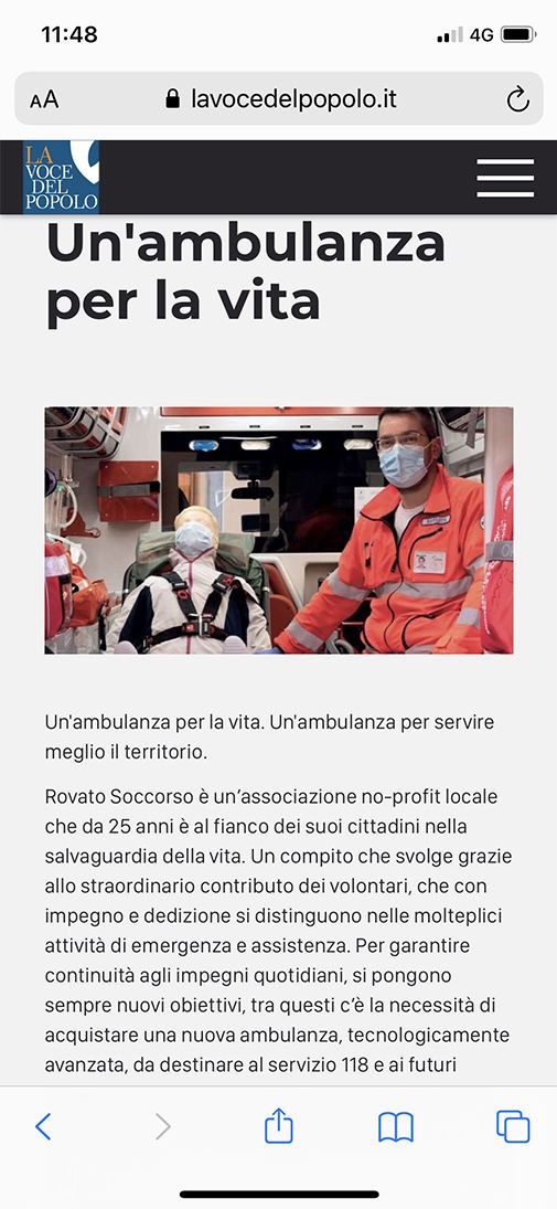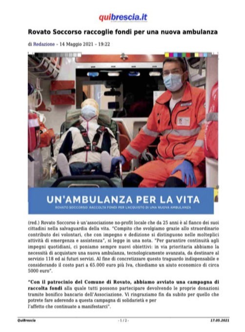 Rovato Soccorso è un’associazione no-profit locale che da 25 anni è al fianco dei suoi cittadini nella salvaguardia della vita. Compito che svolgiamo grazie allo straordinario contributo dei volontari, che con impegno e dedizione si distinguono nelle molteplici attività di emergenza e assistenza.